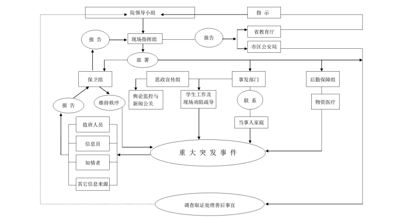 1.重大(Ⅰ级)和较大(Ⅱ级)事件发生后,及时启动本预案,由学院社会安全突发事件应急工作领导小组统一领导处置工作。事发单位迅速组成应急工作领导小组,各应急处置机构根据工作原则和要求,按照职责和分工,迅速投入处置工作。