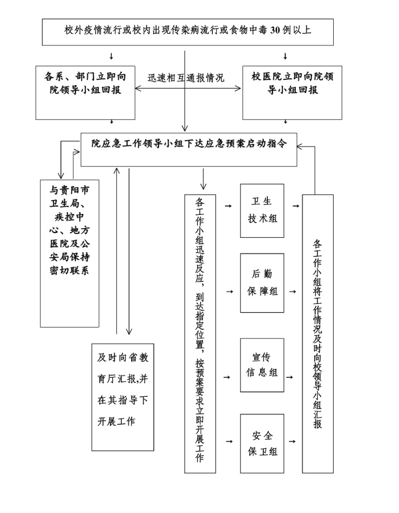 各相关部门接到报警后,应立即进入工作状态。校医院应急工作小组应立即到位,开展医学调查和抢救治疗工作,提出隔离留验或转送地方医院的具体实施办法,报院领导小组批准后立即组织落实。必要时经院领导小组批准,及时与贵阳市疾控中心、市急救中心联系,在他们的指导和支持下开展工作。