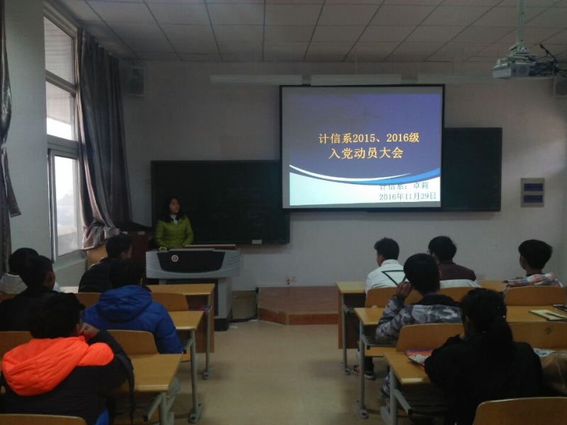 2016年11月29日中午12点30分,在新校区A518多媒体教室,举行入党积极分子入党动员大会,大学入党动员大会。本次会议在学院党委的要求下,计信系2015、2016级所有班委以及部分普通同学参加了此次会议。