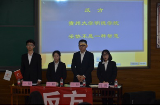 本次比赛在学院与贵阳中医学院两院之间展开,在双方简洁的自我介绍后,比赛正式开始。双方就妥协是不是一种智慧的问题展开辩论,正方贵阳中医学院持妥协是一种智慧的观点,而反方我院持妥协不是一种智慧的观点。双方辩手在立论、驳立论、智辩等各个环节中思路清晰,引经据典,使现场气氛迅速升温,比赛过程中,双方辩手展开激烈的对峙,并对自己所持观点进行论证,正方一辩就妥协是一种智慧列出滴滴打车和快滴打车、网易云音乐和QQ音乐的例子,并围绕这种合作共赢是属于妥协为切入点来展开论述,而反方一辩则从现实生活出发,用历史事实来举例进行层层剖析。攻辩环节中双方更是争锋相对、步步紧逼,现场气氛迅速升温,达到白热化阶段,在随后进行的自由辩论环节中双方辩手就辩题展开更深层次的辩论,将比赛推向高潮。