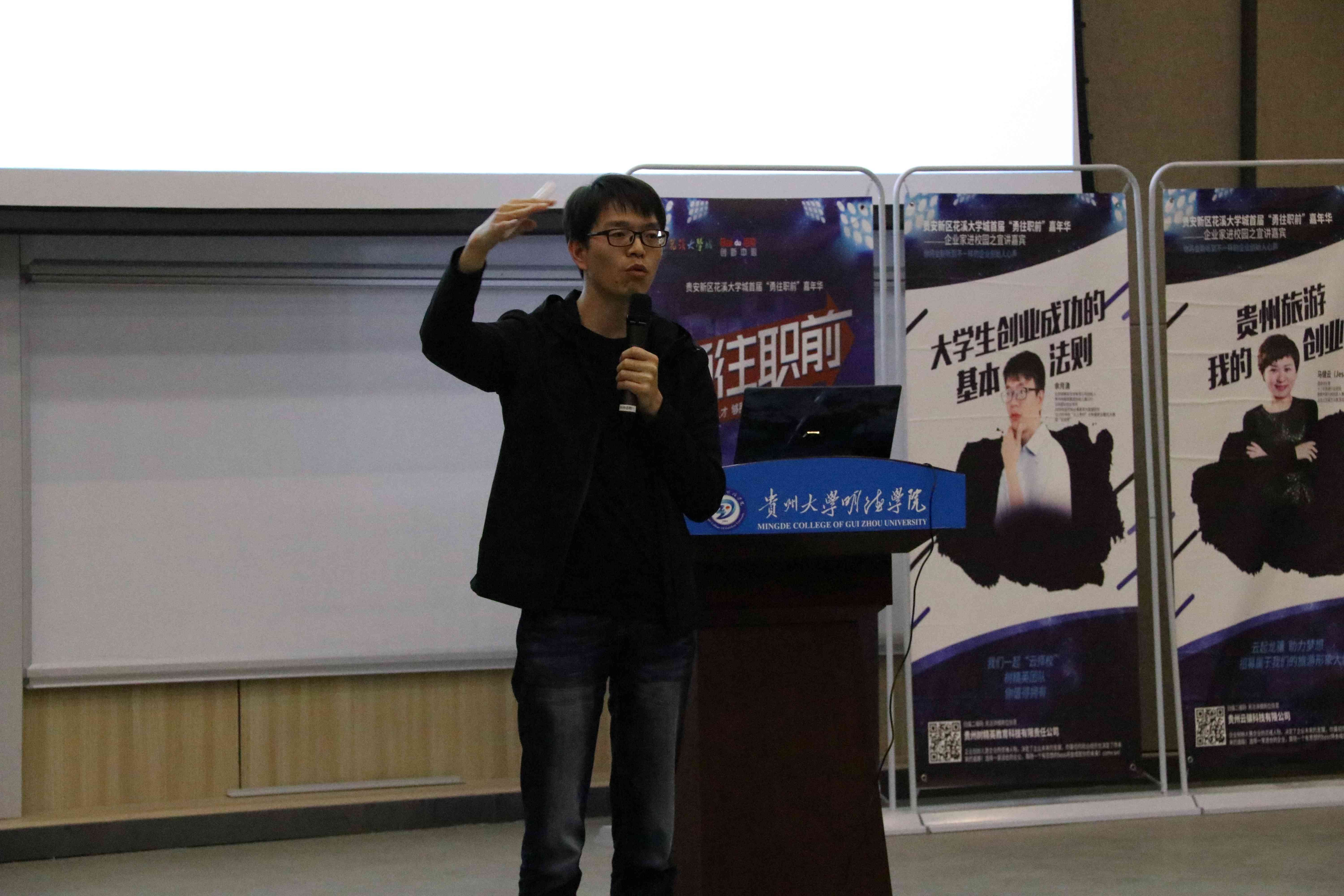 新闻网讯(编辑 杨婷/摄影 朱丽峰 郭仕林)2018年4月19日,我院在新校区图书馆二楼多功能厅开展了首届"勇往直前"嘉年华——企业家进校园讲座,出席本次活动的嘉宾有贵州旅行网创始人兼CEO马健云总裁,北京树精英咨询有限公司创始人、贵州树精英集团创始人兼CEO余月清总裁,费马区块链詹家雨女士、百度创新中心负责人朱盈女士,本次活动由贵州大学明德学院、贵安新区花溪大学城管理委员会、百度(贵安)创新中心主办,由共青团贵州大学明德学院委员会承办,朱盈女士主持了本次讲座。