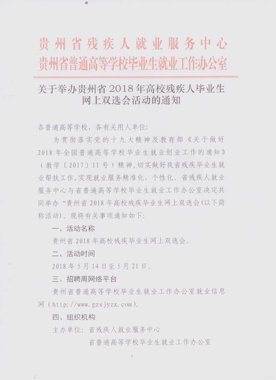 关于举办贵州省2018年高校残疾人毕业生 网上双选会活动的通知