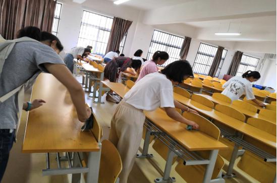 活动以系部为单位进行分工清扫。同志们拿着扫帚、橡皮等清洁工具来到事先分好的教室就埋头苦干了起来,被笔灰粉刷的黑板、课桌上龙飞凤舞的艺术字、粘着双面胶的小广告、还有那被人遗忘在角落里的垃圾、都在同志们有条不紊的节奏中变得焕然一新。