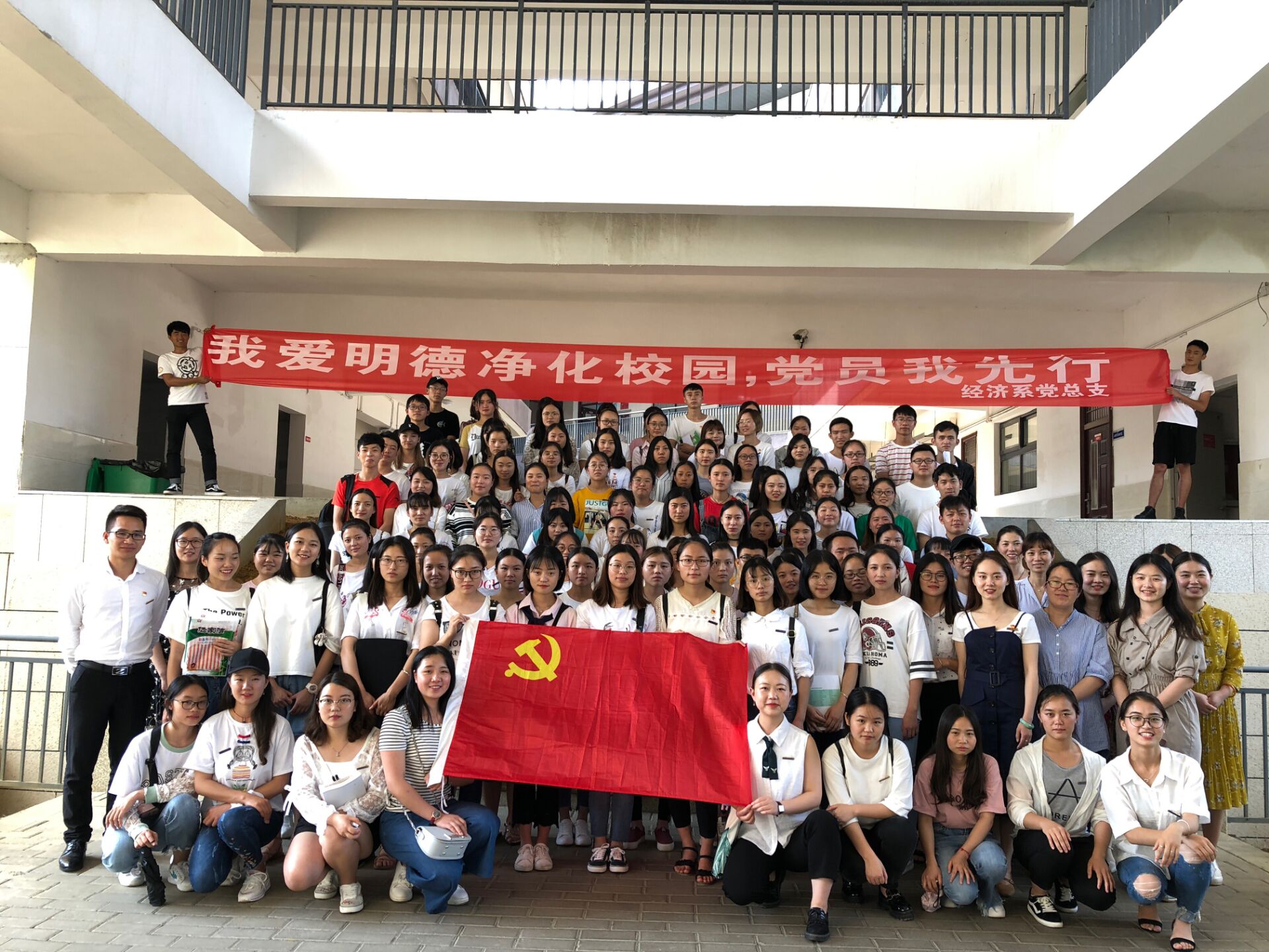 今年是全面贯彻党的十九大精神的开局之年,也是改革开放40周年。在七一建党节来临之际,在习近平新时代中国特色社会主义思想指引下,全党同志正满怀豪情、意气风发,奋力书写实现中华民族伟大复兴中国梦的新篇章。为大力宣传信念坚定、对党忠诚、担当作为、干事创业的新时代典型,激励和引导广大学生党员进一步把思想和行动统一到习近平新时代中国特色社会主义思想和党的十九大精神上来,不忘初心、牢记使命,见贤思齐、锐意进取,努力创造无愧于时代、无愧于人民、无愧于历史的业绩。2018年6月29日下午,我系以“我爱明德·净化校园·党员我先行”主题活动在经管楼隆重拉开帷幕。经济系系主任赵芸同志、经济系党总支书记林红同志、第一党支部书记胡琴同志、第二党支部书记莫建活同志、教师党员、经济系全体学生党员、发展对象以及入党积极分子参加了本次活动。