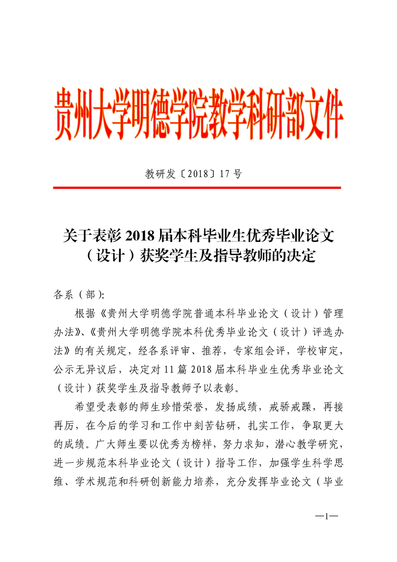 关于表彰2018届本科毕业生优秀毕业论文(设计)获奖学生及指导教师的决定