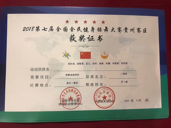 此次啦啦操舞大赛是根据《体育总局体操中心关于印发2018年第七届全国全民健身操舞大赛总决赛竞赛规程的通知》(体操字〔2018〕140号)精神,经研究,省教育厅、省体育局定于2018年9月在贵阳举办2018年贵州省全民健身操舞广场舞比赛。本次竞赛分为学校组和社会组;竞赛内容为有氧健身操、广场健身操、街舞、民族健身操(舞);比赛共计183支队伍,其中街舞自选动作队有13支;录取名次:各组别分别设立一等奖、二等奖、三等奖各一名,并在比赛结束后颁发证书。我院艺术团街舞队荣获街舞自选动作组二等奖。