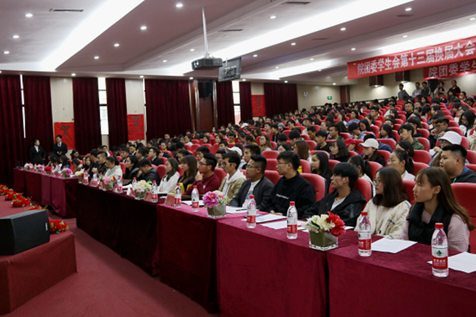 大会开始第一项,全体起立奏唱团歌《光荣啊!中国共青团》。紧接着,大会进行第二项,首先由第十三届院团委学生会第一副书记吴豪杰做年度任期述职报告。他向同学们分享了他两年的大学经历和体验,强调了团队合作的重要性,并要提高自身素质,积极为团队做贡献。接着由团委社团联合会主席翟龙做年度工作总结报告,他发言讲到:作为院团委组织下的一员,应加强内部组织建设,不断完善各项管理制度,以服务社会为基础,力求工作突破创新发展,并分析存在的问题:一社团文化传承应进一步加强,二社团联社团干部的培训,三各部门之间的工作不够紧密,希望今后能加强对相关领域工作的进一步发展,然后团委学生会艺术团团长党豫琳,团委学生会主席陶逸彧依次做了年度任期述职报告。大会进行第三项,团委书记肖蕊,团委马瑞老师上台为第十三届主席团颁发聘书并合影留念。团委罗一檾老师,团委肖皓丰老师为第十三届团委学生会部长代表发放聘书并合影留念。再次请罗一檾老师和肖皓丰老师为第十三届艺术团代表以及社团联合会部长代表发放聘书并合影留念。大会进行第四项,第十四届团委学生第一副书记何湘龙上台做任职报告,对团委的未来做了规划,第十四届团委学生会主席杨芳阐述自己的工作职能,第十四届团委学生第二副书记田金洋对自己的职能以及分管部门进行介绍,第十四届团委学生会副主席安飞、唐珲、杨海、李自东,第十四届团委学生社团联合会副主席周杨、李鑫华依次上台对自己所分管的部门做任职报告。第十三届优秀部门部长代表胡蓉蓉发言。