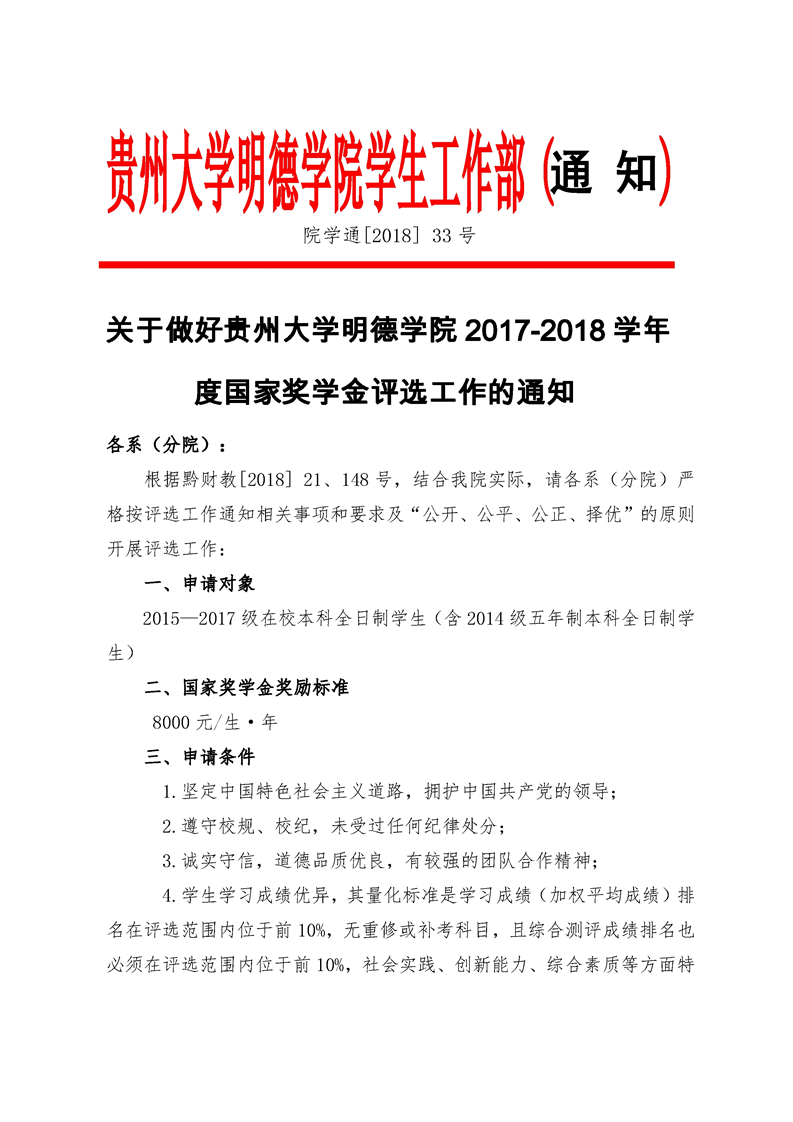 关于做好贵州大学明德学院2017-2018学年国家奖学金评选工作的通知