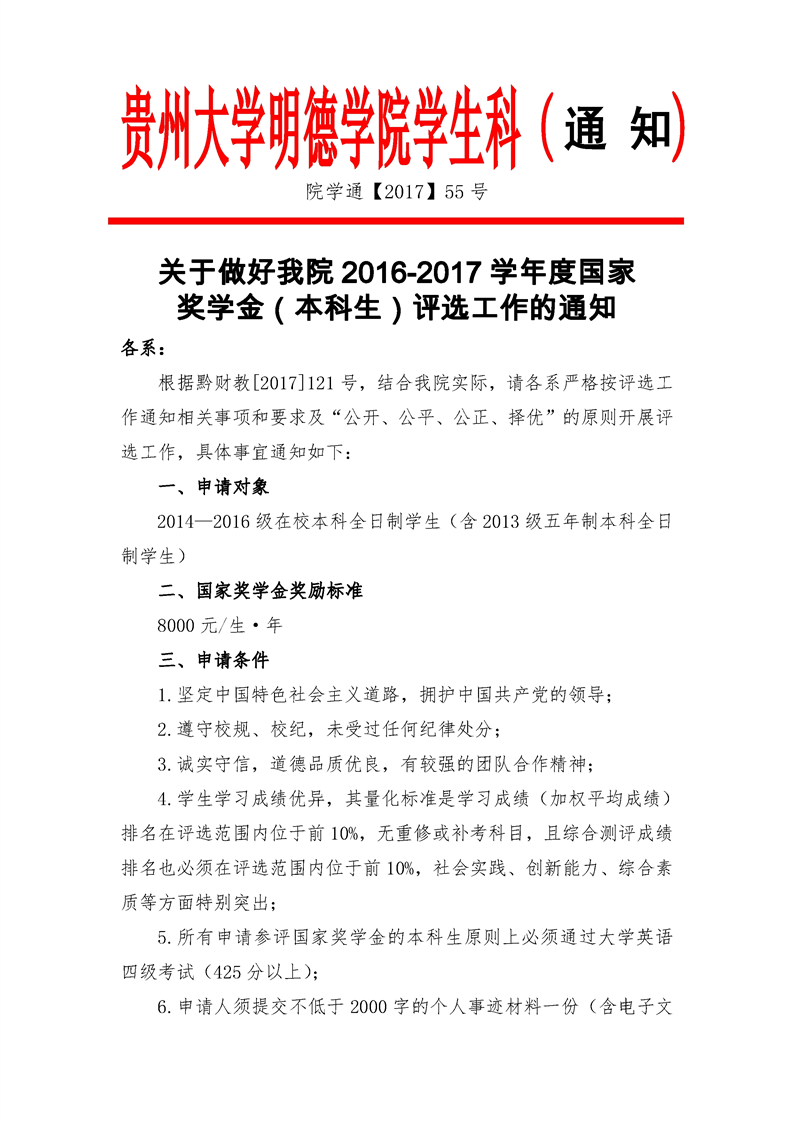 关于做好我院2016-2017学年度国家 奖学金(本科生)评选工作的通知
