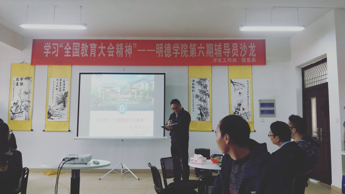 2018年10月24日14:00,由贵州大学明德学院学生工作处与信息工程系合办的学习"全国教育大会精神"---明德学院第六期辅导员沙龙在A410顺利开展。此次活动旨在学习贯彻2018年全国教育大会精神,加强各辅导员的思想政治教育工作,促进各系辅导员间的工作交流、增进辅导员情谊。
