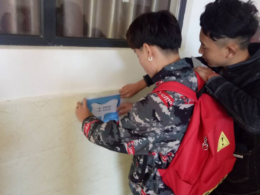 本次活动分小组进行,学生会各个部门为一个小组自己收集标语并制作,然后分别在生物楼每层的教室、走廊、楼梯道、厕所进行美化粘贴。粘贴过程有条不紊,其中粘贴的各类标语用独到丰富的语言,简洁明了的表达了爱护校园的意义。