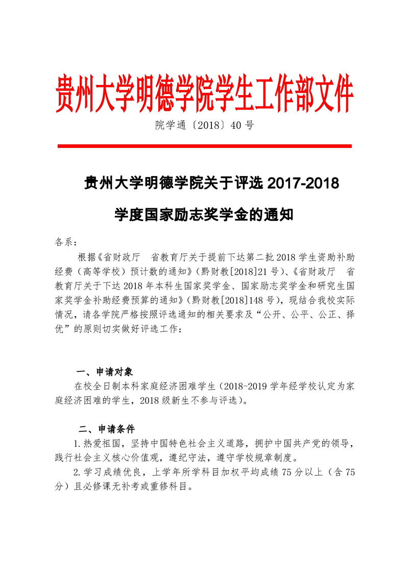 贵州大学明德学院关于评选2017-2018 学度国家励志奖学金的通知