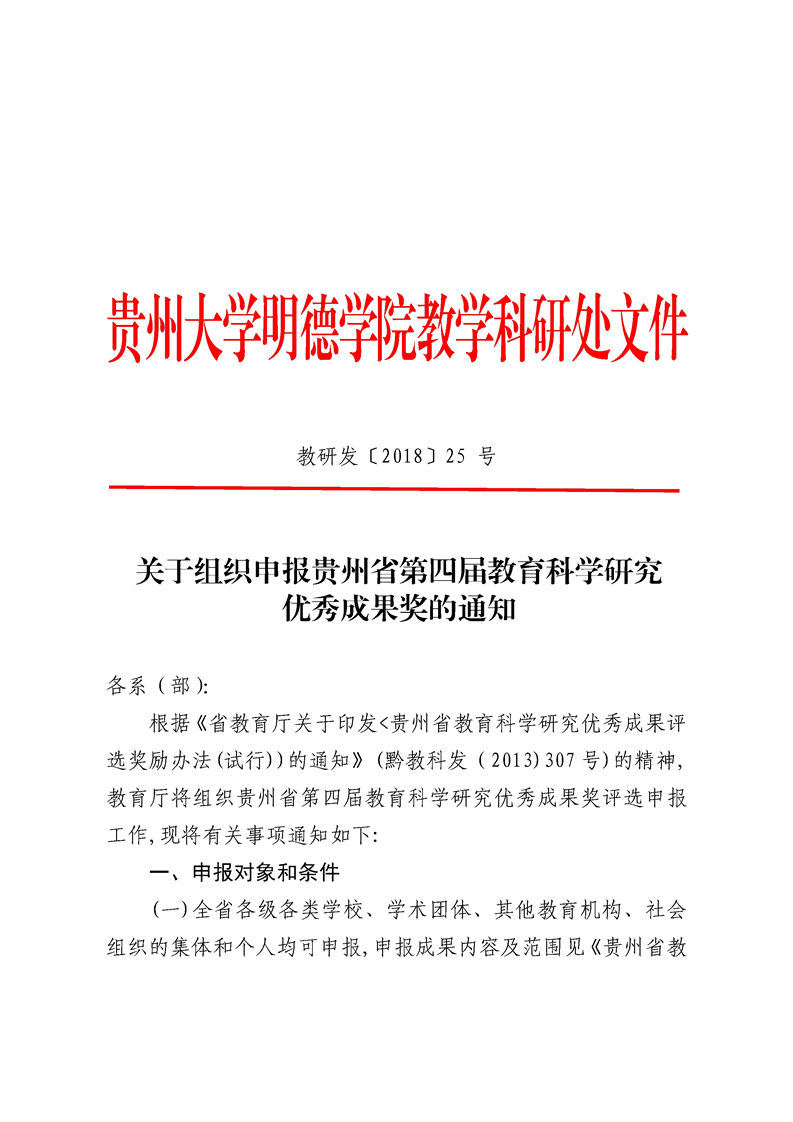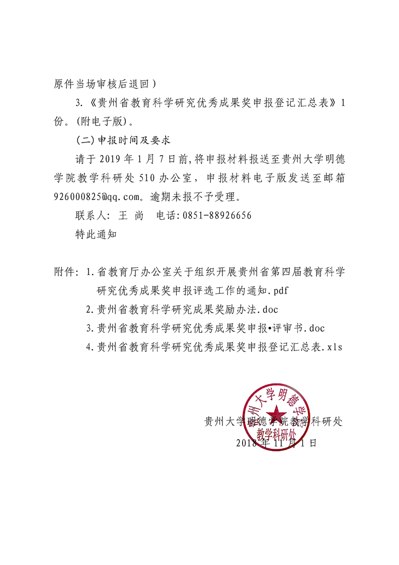 附件:附件1:省教育厅办公室关于组织开展贵州省第四届教育科学研究优秀成果奖申报评选工作的通知.pdf 附件2:贵州省教育科学研究成果奖励办法.doc 附件3:贵州省教育科学研究优秀成果奖申报•评审书.doc 附件4:贵州省教育科学研究优秀成果奖申报登记汇总表.xls