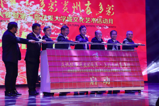 新闻网讯(团宣/李凯 摄影/何婷)11月21日,由贵州省教育厅、贵安新区管委会、贵州日报报业集团主办,贵州大学、贵州师范大学、贵州民族大学、贵安新区花溪大学城管委会、贵安新区社会事务管理局、贵安新区报传媒有限责任公司承办,贵州民族大学人文科技学院、贵州城市职业学院、贵州黔坊企业管理有限公司、贵州省群升置业有限公司协办的“庆祝改革开放40周年·多彩贵州有多彩——贵州首届大学生民族歌舞大赛暨第五届花溪大学城文化艺术活动月”在贵州民族大学花溪大学城校区正式启动。出席本次启动仪式的领导有:省委网络安全和信息化委员会办公室主任,省委宣传部副部长,省新闻出版局局长谢念、贵州日报报业集团党委副书记,总编辑万群、省文化和旅游厅巡视员黎盛翔、省教育厅副厅长鞠洪、贵安新区管委会副主任邓波、贵州民族大学党委书记张学立、党委副书记张鹏程、贵州医科大学党委副书记战勇、贵州师范大学副校长杨胜天、贵州轻工职业技术学院副书记杜平、花溪大学城党工委副书记,管委会主任罗松华、贵州日报报业集团董事长助理,贵安新区报总编杨龙,以及花溪大学城各高校有关领导、贵安新区各部门干部职工、花溪大学城入驻企业代表,参加本次活动的还有大学城各高校学生代表。