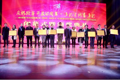 活动到达尾声,主持人宣布获得组织奖的高校,我院荣获组织奖。贵州日报报业集团党委书记、社长邓国超,贵州民族大学党委副书记、校长陶文亮,贵州师范大学党委副书记银熙惠,贵州财经大学党委委员副校长杨勇,贵州日报报业集团董事长助理陈鹏宇、代乐,贵安新区花溪大学城党工委委员纪工委书记刘云东为包括我院在内的学校颁发组织奖。获得组织奖的同时,我院罗一檾老师荣获优秀指导老师奖,同时我院嘻哈社的原创歌曲《大明屯堡》入围前八强,荣获优秀奖。活动最后,领导及嘉宾、演员上台合影留恋。