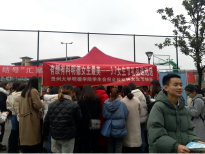 新闻网讯(团委/罗一檾 团宣/徐晨飞 摄影/侬超艳)3月7日,我院在花溪大学城校区一号食堂门口对面举行了“有颜有料明德女生最美—3.7女生节礼品送送送”活动。本次活动由贵州大学明德学院团委组织部承办。