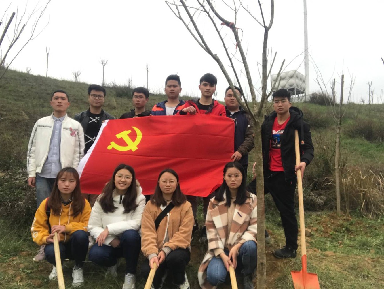 新闻快讯(党支部 卯升粉“风华正茂,书生意气”。吹拂阵阵着春风,一年一度的植树节到来。为了更好地建设绿色校园,进一步推增强党员环保意识,践行社会主义核心价值观,共创美丽新中国。我系学生第一党支部党员、预备党员、入党积极分子于2019年3月13日中午12:30在学院图书馆后山举行了以“建设绿色校园”为主题的义务植树活动。