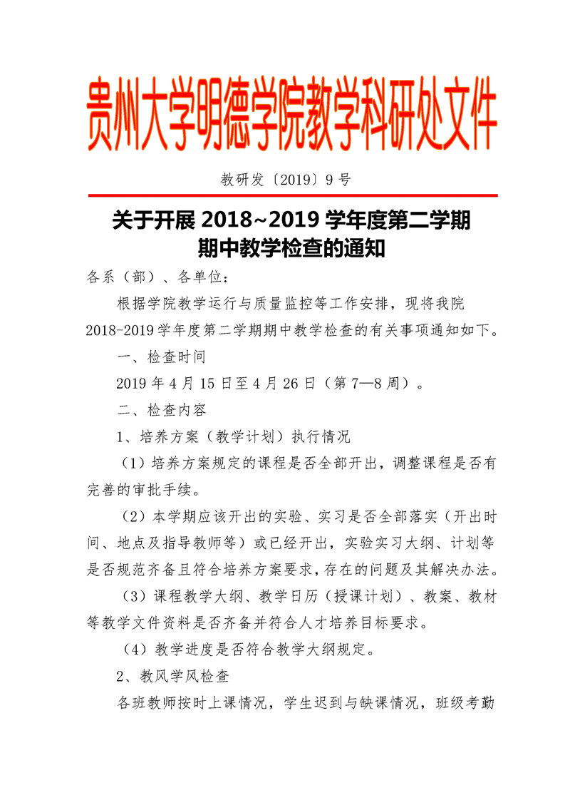 贵州大学明德学院关于开展2018-2019学年度第二学期期中教学检查的通知