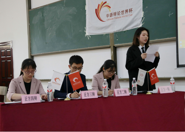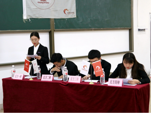 参加本次比赛的正方是持观点“大学生成长更应注重顺应社会需求”的贵州财经大学,反方是持观点“大学生成长更应注重坚持个人理想”的贵州大学明德学院。经双方辩友简单的自我介绍后,比赛正式开始。首先是正反方的开篇立论和质询阶段,接着双方二辩进行质询小结,双方四辩进行对辩。紧接着是盘问阶段:分别是由正方三辩盘问反方一、二、四辩,反方三辩盘问正方一、二、四辩。随后双方依次进行盘问小节环节。盘问小节结束,比赛进行到最激动人心的环节--自由辩论环节,双方辩友稳定自如地将比赛推向高潮,并机智应答对方所提问题。紧张而激烈的自由辩论环节结束后,正反四辩分别进行总结陈词阶段。