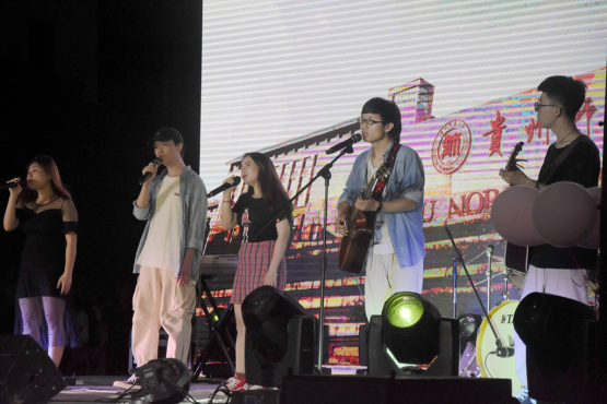 接着是我院的Dreamer乐队,他们带着理想与信念,携着一股朝气蓬勃的劲为观众带来歌曲表演《让我留在你身边》和《思念是一种病》。我院音乐协会乐队成员热情洋溢的表演结束后,其他高校乐队相继为观众带来精彩演出,演出内容分别是:贵州医科大学吉他部夕阳红乐队--《爱要怎么说出口》、贵州民族大学瞎玩乐队--《大风吹》、贵州财经大学迷失玫瑰乐队--《再见杰克》和《公路之歌》。到此,音乐表演环节告一段落,一场视觉盛宴开始,首先是贵州轻工职业技术学院带来蒙古舞蹈表演--《故乡和马》,接着是贵州方梦纺织科技有限公司带来床品创意梯台走秀,最后是最受观众青睐的抽奖互动。紧接着,乐队的精彩表演将活动拉回主题,这一轮是贵州民族大学人文科技学院及时行乐和森林乐队这两个乐队各自带来的歌曲《山海》、《我还年轻我还年轻》和《茶底世界》、贵州师范大学烟锅巴乐队的歌曲表演《我们的时光》和《山风一样自由》。表演结束后,又是激动人心的抽奖环节。抽奖完毕,最后一轮精彩继续进行—贵州民族大学人文科技学院保持警惕乐队带来歌曲《保持警惕》和《孤独街头》、非岩乐队带来歌曲《春风十里》。至此,主持人宣布活动结束,并邀请领导、嘉宾以及工作人员上台合影留念。