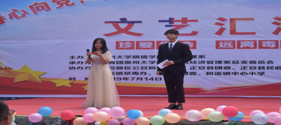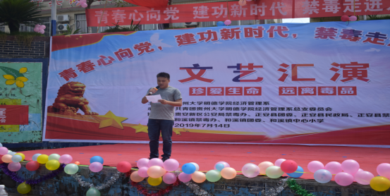 展现多样风采,筑梦美好未来。天下没有不散的筵席,7月14日经管系2019年以青春心向党,建功新时代,禁毒走进万户家庭为主题的“三下乡”文艺汇演于和溪镇文化广场成功举办。出席本次活动的领导嘉宾有正安县团委副书记张艺波、正安县禁毒办工作人员付斌、和溪镇派出所教导员秦会玉、和溪镇禁毒办工作人员吴刚毅、和溪镇中心小学副校长度环、贵州大学明德学院土木工程系第五党支部书记赵义远、贵州大学明德学院经管系老师莫建活以及和溪镇当地居民。由正安县团委副书记张艺波致开幕词。