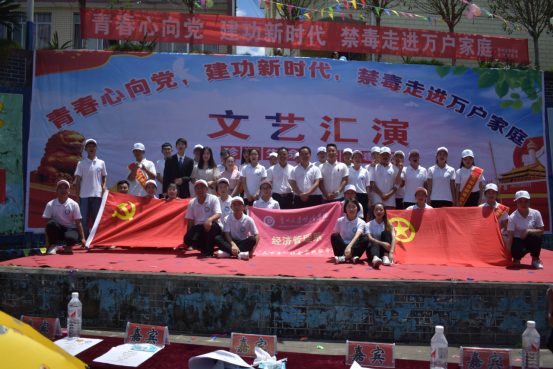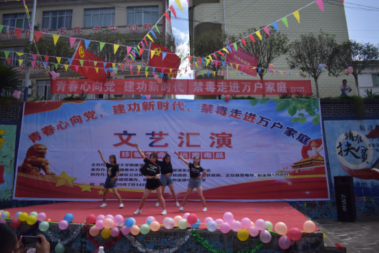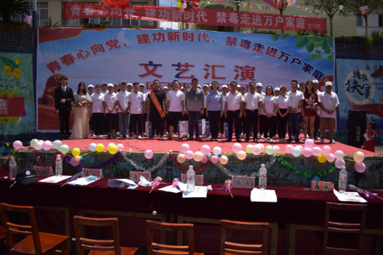 青春不息,禁毒不止。主持人给现场观众介绍了毒品的危害及模型,同时也在现场展示各类毒品模型。接着队员们给观众带来了诗歌朗诵《远离毒品》,他们用凝强的声音诠释了吸毒的危害。文艺汇演大家参与,文艺汇演共同参与,当地学生给大家带来歌曲《我有一个好妈妈》以及舞蹈《kinjabang》.和歌曲《成都》。接着给当地居民送上了我们的祝福和礼品。接着由赵义远老师为龙琴等5位本次“三下乡”优秀先进个人颁奖。最后一首和唱《歌唱祖国》和歌曲《再见》给本次文艺汇演做了收尾。