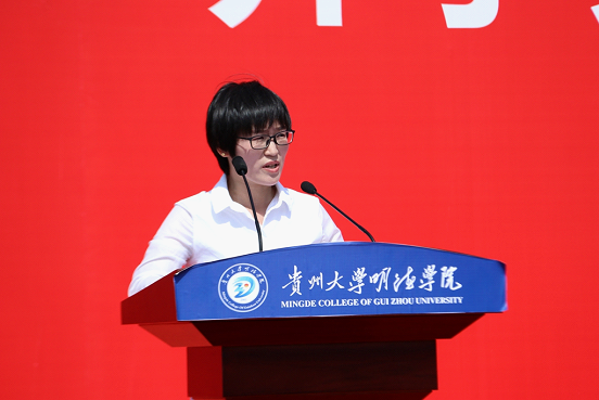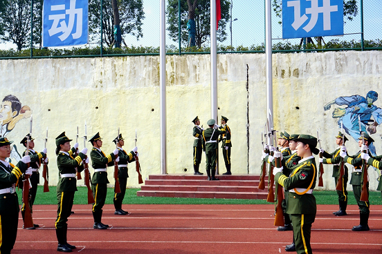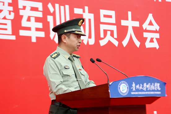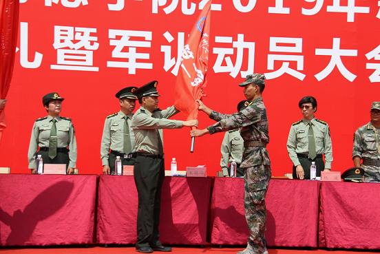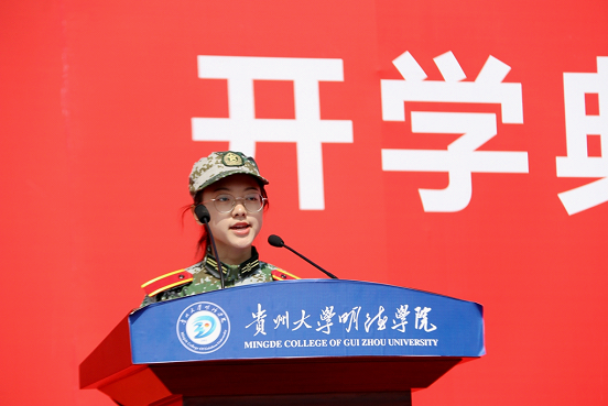 大会进行第五项,首先贵州大学明德学院2019级新生军训团团长王颖华宣读成立《贵州大学明德学院关于成立2019级新生军训团的通知》,并为2019级新生军训团授旗。接着,贵州大学明德学院2019级新生团军训团政委郭林桦做军训动员报告,并说道:今天,是中国人民抗日战争胜利和世界反法西斯战争胜利纪念日,在这样一个纪念日举行军训动员大会,是要让同学们共同铭记中国人民为世界反法西斯战争胜利所做出的历史贡献和巨大牺牲,“铭记历史、缅怀先烈、珍爱和平、开创未来”,以史为鉴,珍惜和维护来之不易的和平环境。最后,军训教官代表冉小旭对军训工作进行表态,并率领全体参训学员进行宣誓。至此,活动圆满结束。