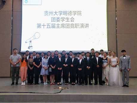 新闻网讯(团委/罗一檾团宣/陈力 摄影/徐晨飞)6月13日,我院在花溪大学城校区图书馆报告厅举行“团委学生会第十五届主席团竞职演讲”活动。参加本次活动的老师和嘉宾有:贵州大学明德学院团委书记肖蕊,贵州大学明德学院土木系党总支副书记朱佳纯,贵州大学明德学院团委老师罗一檾、李宣志和马瑞,各系老师代表以及各部门学生代表。本次活动由共青团贵州大学明德学院委员会主办。主持人宣读评分细则后,活动正式开始。