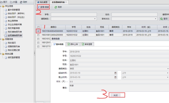 当学生账号被管理端授予班长权限时,登录系统后可点击全班请销假列表查看本班学生请销假情况,勾选行后,点击查看/编辑按钮,可查看详细信息,如下图