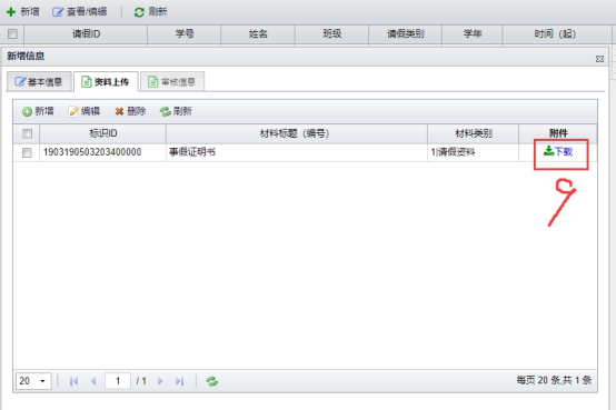 2、如果需要提交辅助资料,点击“资料上传”标签,在资料上传标签内点击“新增”按钮,可以上传相关辅助审核资料,如事假证明资料、医院病例等,在班主任审核之前均可上传审核辅助材料