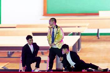 第二阶段:识今朝——牢记使命。由音乐协会与自行车社共同带来《山海》、《无名之辈》,礼仪社带来《礼为贵》,拉丁舞社表演拉丁舞《火》,共同表达对祖国的礼赞和祝福。第二阶段由韦冠东老师进行互动环节,抽取幸运同学。