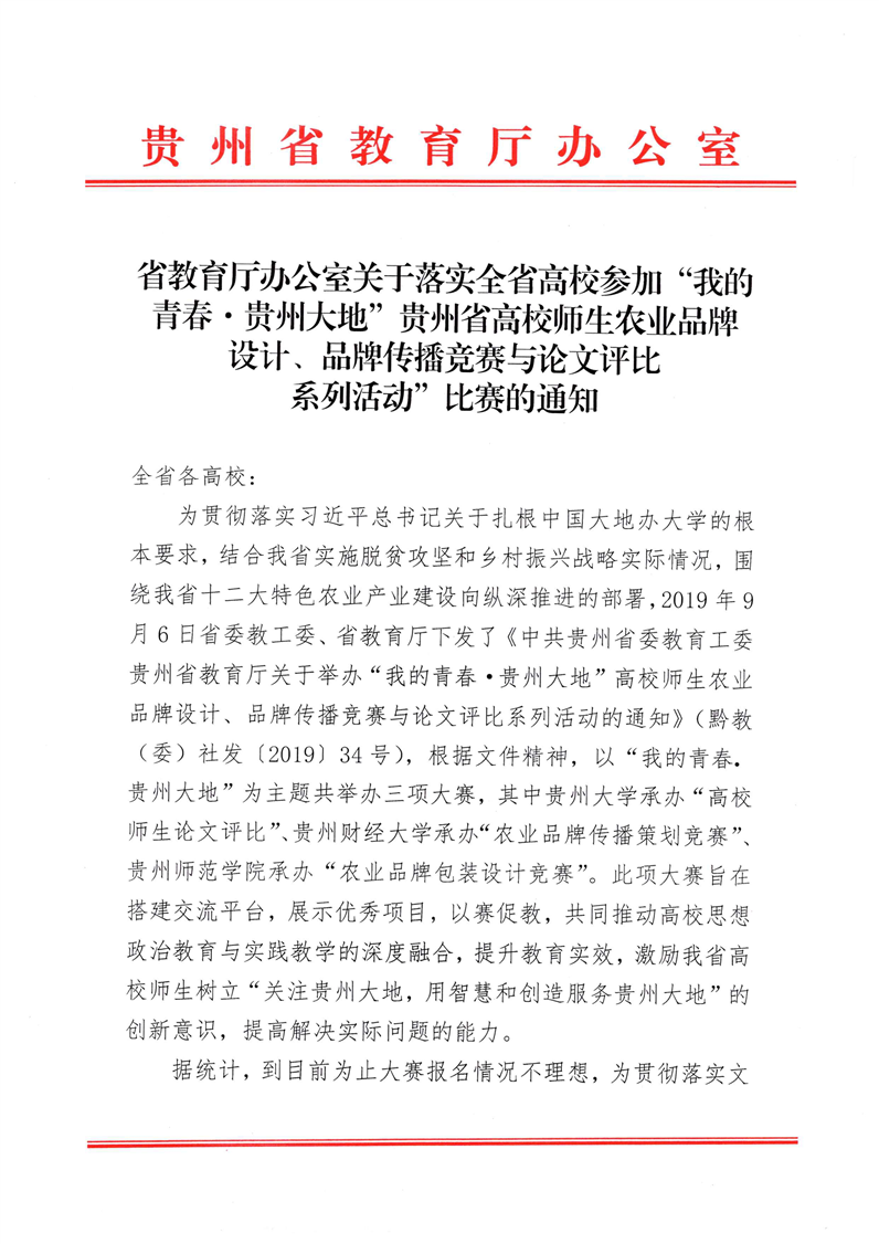 关于转发省教育厅办公室关于落实全省高校参加“我的青春·贵州大地”贵州省高校师生农业品牌设计、品牌传播竞赛与论文评比系列活动”比赛的通知
