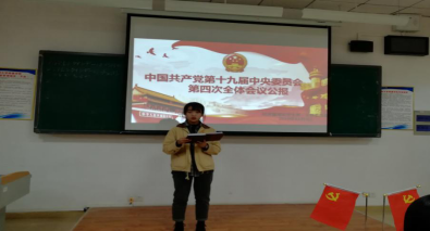 为深入贯彻党的路线方针,认真学习“中国共产党第十九届中央委员会第四次全体会议公报”。2019年11月4日,经济管理系学生第一党支部在A518组织党员集中学习了“中国共产党第十九届中央委员会第四次全体会议公报”。本次会议由黄肖珺珂同志主持开展,22名预备党员参加了本次会议。