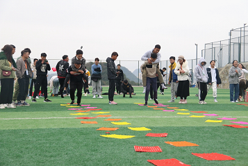 活动第四项“万花筒”,游戏规则:所有人围成一个圆圈跑,当负责人任意发出指令时,参与人员按照口诀要求组队抱团。活动第五项“结对而行”,游戏规则:将每组成员的左腿或右腿绑在一起,多组并排站在起跑线上,当负责人喊开始时,最先到达终点的组获得胜利。活动第六项“踩指压板”,游戏规则:由每班抽取十人,两两组合,背着另一人在指压板上行进,十人全部通过,用时少者获胜。每一项游戏都充分考验着每一小组的团结合作能力。
