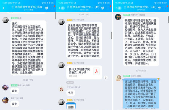 疫情期间,信息工程系全面有序开展党建工作。2月8日,信息工程系学生第一党支部通过QQ召开线上会议,传达学习习近平总书记关于新型冠状病毒感染的肺炎疫情防控工作的重要指示精神、中央政治局常委会议精神和《中共贵州省委关于深入贯彻习近平总书记重要指示精神坚决打赢新型冠状病毒感染的肺炎疫情防控阻击战的紧急通知》、《中共贵州省委关于认真学习贯彻中共中央关于加强党的领导、为打赢疫情防控阻击战提供坚强政治保证的通知》的通知以及李邑飞部长讲话精神。