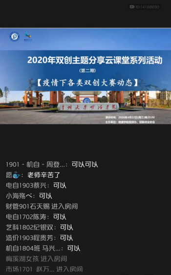 4月22日晚,由双创办、学工处、团委组织的明德学院2020年双创线上活动暨双创主题分享云课堂第二期圆满开播,双创办王小军老师就“疫情下双创竞赛动态”作直播演讲,学院千余师生在线参与互动。