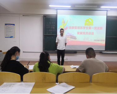 为吸收优秀学生,壮大党员队伍,增加支部力量,2020年6月9日,按照发展党员有关程序要求,健康管理系学生第一党支部在F406教室与发展对象谈话。本次谈话由健康管理系学生第一党支部支委组织开展,参与人员应到18人,实到16人。