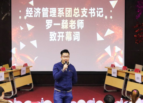 此次辩论赛由经济管理系团总支书记罗一檾老师为比赛致开幕词,主持人宣读比赛规则以及参赛班级。