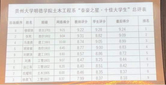 新闻网讯(供稿/许仪星 供图/王永祥)11月13日,我系“泰豪之星·十佳大学生”评选活动在图书馆报告厅成功举办。此次评选活动特邀:贵州大学明德学院王颖华院长、土木工程系主任龚锟老师、土木工程系党总支书记王朋虎老师、土木工程系主任助理康厚泽老师、土木工程系学生会团总支书记杨艳老师、土木工程系辅导员郭东越老师、土木工程系辅导员邱睿老师、土木工程系辅导员黄梦男老师、土木工程系辅导员丁操老师、土木工程系辅导员李佳鹰老师。