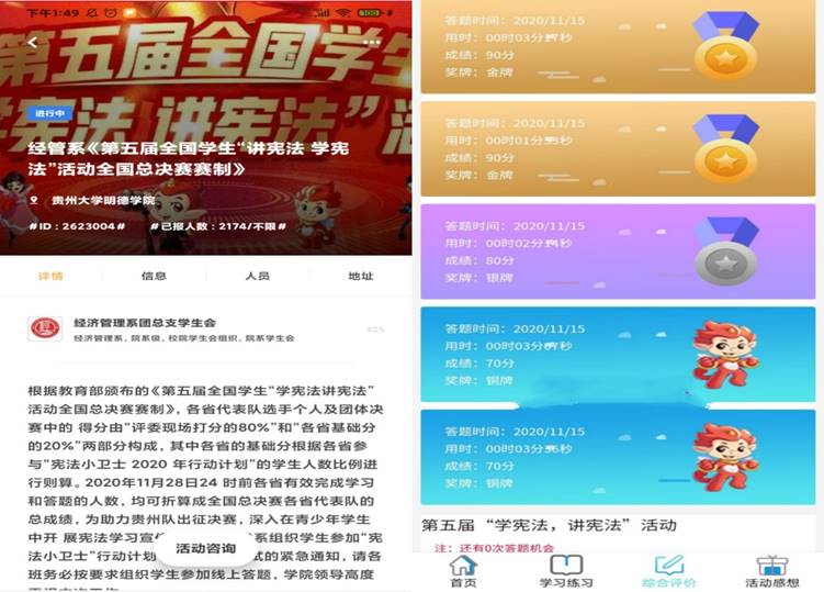 为此,我系于2020年11月13日至11月26日开展“宪法小卫士,2020年行动计划”线上答题活动,参加对象为贵州大学明德学院经济管理系所有在校学生。我系釆取有效方式(到梦空间)积极组织报名让学生参加教育部的“宪法小卫士 2020年行动计划",而且我系优先完成此项工作,开始答题第一日就已经达到了96.3%完成率,力争实现全覆盖。