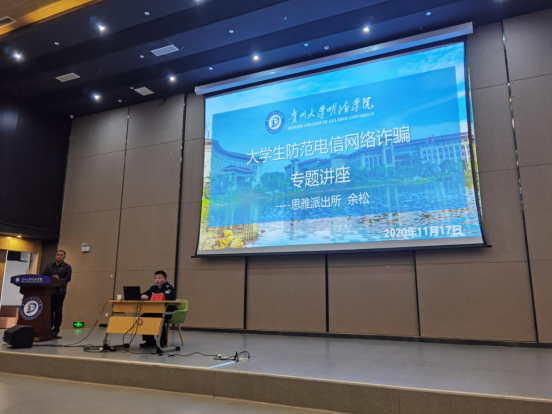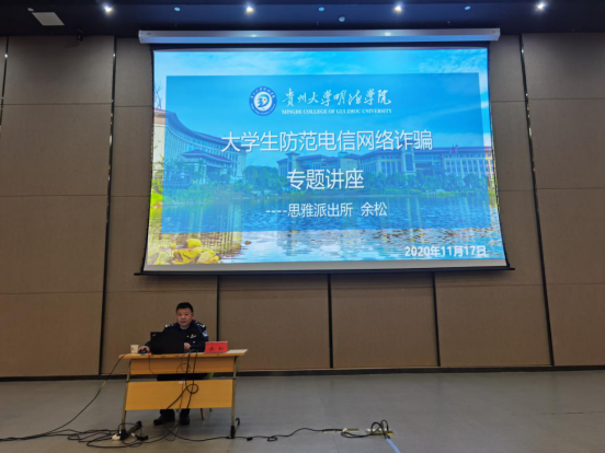 11月17日下午,保卫处特邀贵安新区公安局思雅派出所副所长余松警官到Beat365图书馆作了 “防诈骗”知识宣讲,近300学生聆听讲座,旨在向全体师生宣传普及防诈骗知识。讲座由保卫处处长冉小旭主持。
