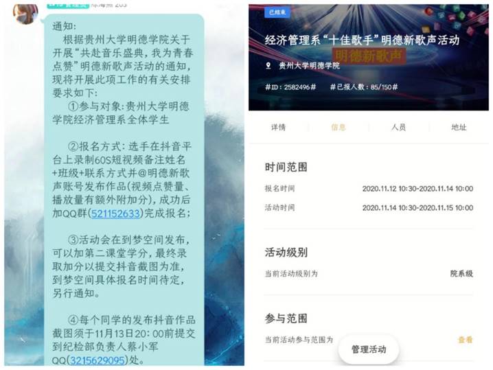 (图为我系到梦空间发布活动及到各班群发活动通知截图)