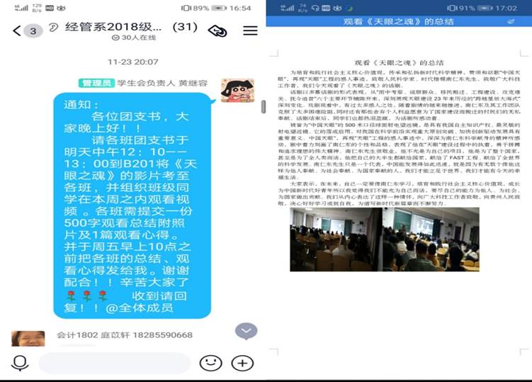 新闻网讯(供稿/经济管理系 罗一檾 陈丹 供图/经济管理系 新闻中心)为传承和弘扬新时代科学精神,再现“天眼”工程的撼人事迹,致敬人民科学家、时代楷模南仁东。为此,经济管理系各班团支书于2020年11月24日组织本班同学在本周之内观看《天眼之魂》,并且各班需提交一份500字观看总结附照片及一篇观看心得。各班也在规定时间内提交了观看总结及心得,完成得十分出色。