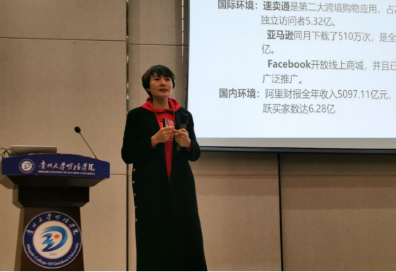 讲座伊始,朱莹就“新媒体+新电商带动贵州产业发展”作精彩分享。她认为,在疫情冲击下,2020年是新媒体+电商巨量爆发的一年,媒体和电子商务开始形成价值链,越来越多的企业建立了新媒体营销矩阵以推动电商发展,而电商升级的方向就是以IP造就文化附加值。由此,具有深厚民族文化底蕴的贵州在新电商时代下迎来巨大机遇,通过短视频、直播等形式可以更好地呈现贵州文化特色并迅速造就文创电商局面。她号召,贵州大学生可立足于贵州文化底蕴,借助新媒体+电商的发展机遇开创事业,或将自己定位成贵州产业人才为导向参与项目实践锻炼。