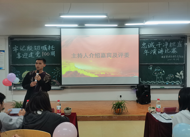 由我系团总支学生会第一副书记李章贵向大家致开幕词,他表示:为更深入的开展党史学习教育和学习中国发展的道路,希望参赛同学们在演讲的过程中将主题充分的表现出来,让大家更深入的了解主题的内容,同时也预祝大家取得佳绩!