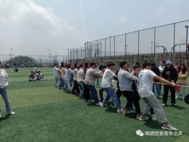 活动第五项“拔河”,游戏规则:地上画3条直线,间隔为2米,居中的线为中线,两边的线为河界,一场比赛由两队参加,每队上场人数要相等,双方各自一起用力拉绳,将标志带拉过本队河界的队伍获胜。
