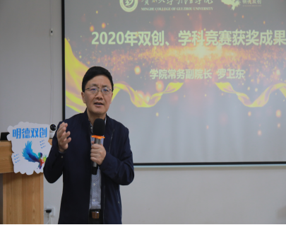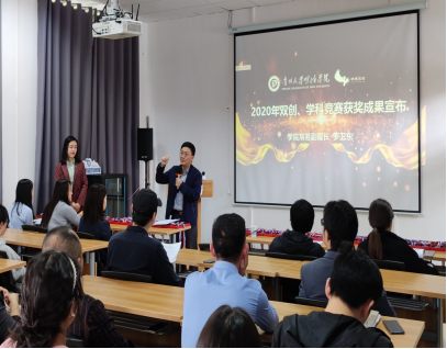 学院常务副院长罗卫东会上宣读学院2020年双创、学科竞赛获奖成果。2020年学院组织参与教育部竞赛以及各省教育厅主办赛事共计20项,获得省级以上奖项的赛事共计13项。在获奖赛事中,学院共诞生获奖项目共计45个,获得省级以上奖项共计50项。其中,重点实现突破的成果有: