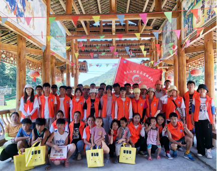 (图为团队在八界村文化长廊与孩子们合影留恋)