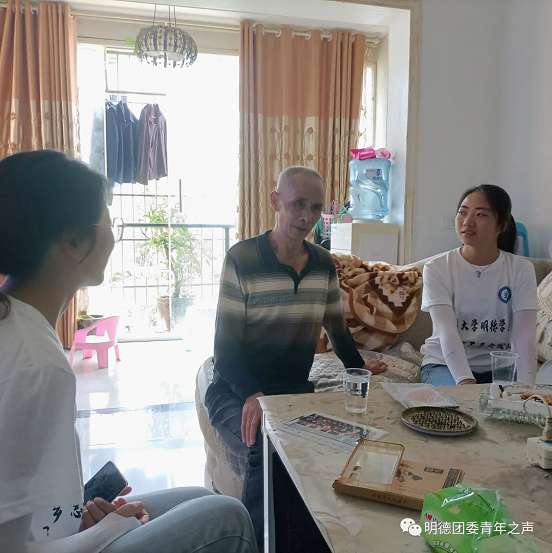 最后一组志愿者们来到亿滕小区拜访慰问老党员罗登银爷爷,并为罗爷爷送去了一些物资。对于志愿者们的拜访慰问,罗爷爷表示很开心,并与志愿者们分享了他年轻时修桥筑路、建设家乡的事迹,也对志愿者们的到来表示感谢!通过与罗爷爷的谈话得知他是1995年入党,年轻时在村里担任村支书并且积极向党组织靠拢。此外,志愿者们还从罗爷爷口中得知他的子女长期在外打工,孙儿也是在外上学,长期不在身边。独身一人的罗爷爷通常是与周边邻居在广场跳舞来作为娱乐消遣。