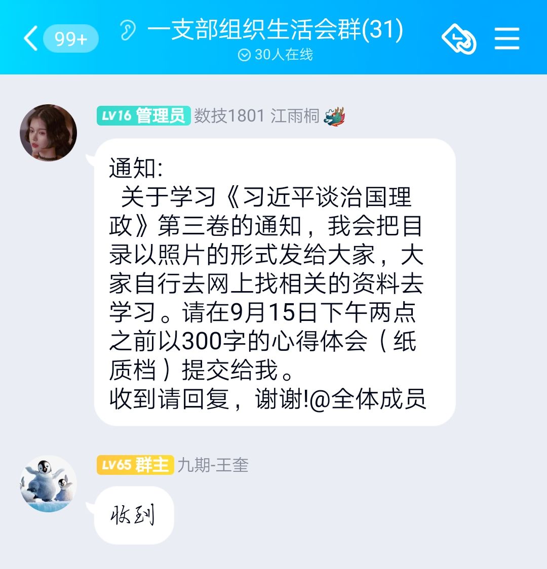2020年9月14日星期一,数字传媒系学生第一党支部组织开展关于《习近平谈治国理政》第三卷的自主学习,此次学习的参与人员有数字传媒系学生第一党支部正式党员3名,第九期预备党员14名、第十期预备党员9名。